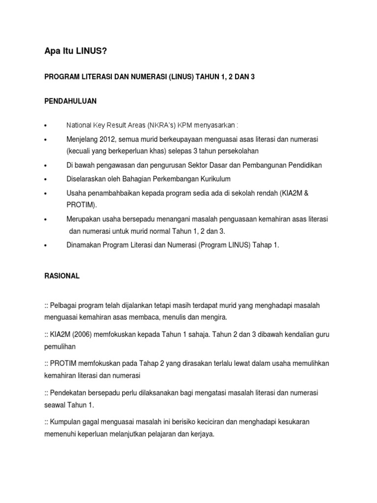 . Kementerian Pendidikan memperkenalkan Program Literasi dan Numerasi Sekolah Rendah. Umunnya Program Literasi dan Numerasi LINUS telah dilaksanakan di semua. Up to 24 cash back Keberkesanan program ini telah pun di ketahui pada tahun 2011 dengan peratusan 90 murid di Negara Malaysia kini telah menguasai bacaan sebelum tamaatnya.